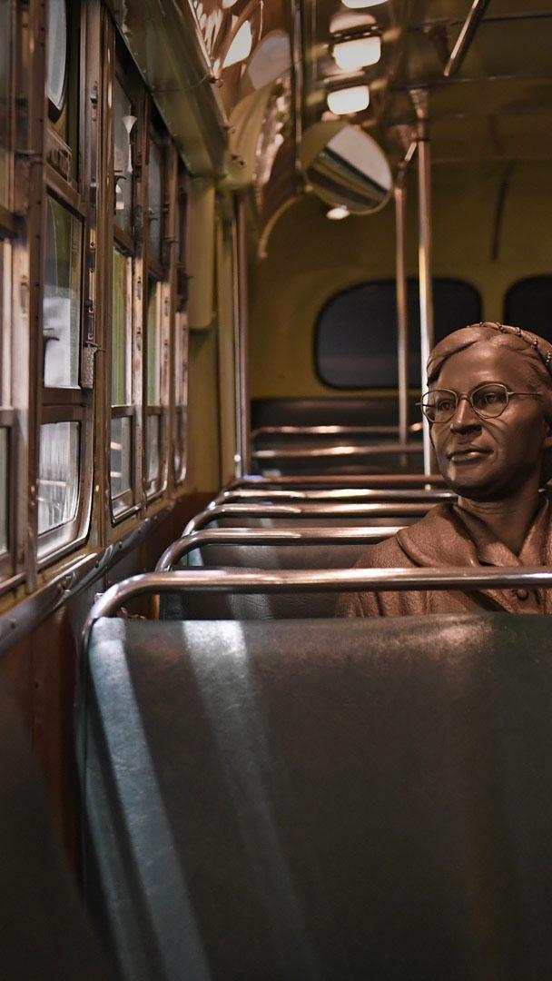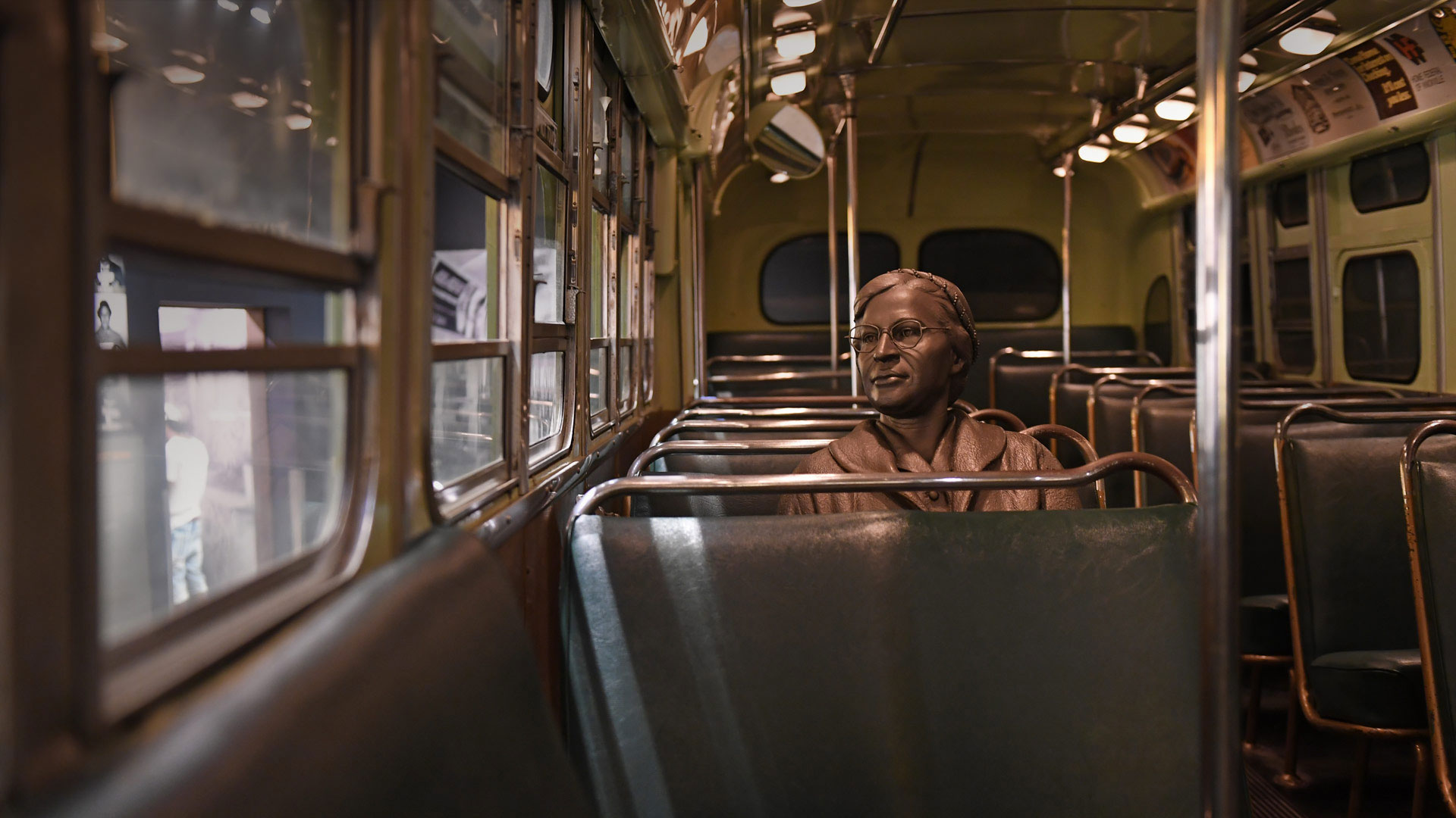 Here at the National Civil Rights Museum in Memphis, Tennessee, you can sit down next to a sculpture of civil rights icon Rosa Parks, who was born on this day in 1913. Parks was arrested in 1955 for refusing to give up her seat to a white passenger on a segregated bus in Montgomery, Alabama. Her defiant action sparked the Montgomery Bus Boycott, one of the longest and most successful movements against racial segregation in our nation’s history. At the time, African Americans made up most of the ridership on Montgomery city buses. The year-long protest finally ended when the US Supreme Court ruled that Alabama’s laws enforcing segregation on city buses and other modes of transportation were unconstitutional.
