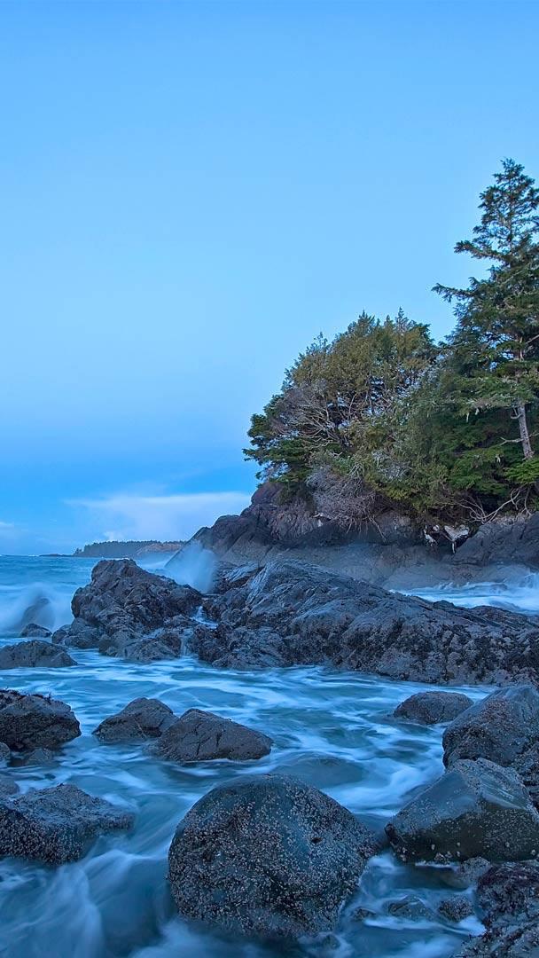 Gray whales migrate between their feeding grounds and breeding grounds each year. North Pacific gray whales wisely spend the winter at their breeding grounds in the warm waters off the Baja California Peninsula. Then, by mid-March, as the whales return north, they pass by the west coast of Vancouver Island, near Tofino, en route to their summer feeding grounds in the Bering Sea. Tofino, an outdoorsy retreat on Clayoquot Sound, provides a breathtaking backdrop for whale watchers this time of year. After the whales have passed through, the area continues to attract outdoor enthusiasts who are drawn to legendary surfing, hiking, and storm watching along the dramatic coastline.